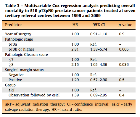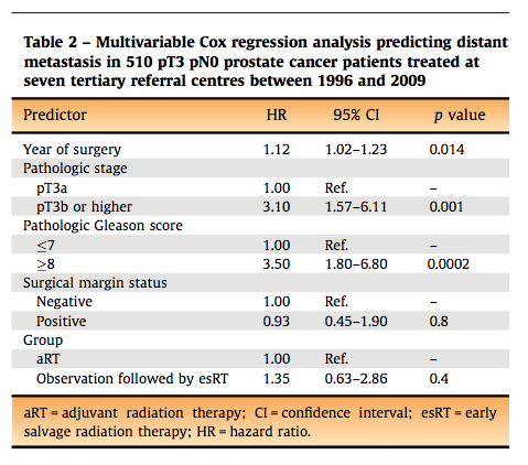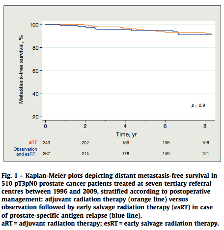 En el estudio se estratificaron dos grupos el primer grupo fueron pacientes tratados con aR mientras el segundo grupo era pacientes sometidos a observación seguido de tsR en caso de recaída del PSA entendida esta con valores de PSA menores a 0,5 ng por mililitro.
