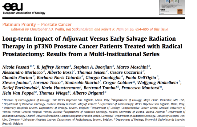 Esencialmente existen dos opciones terapéuticas en el caso de tumores pT3 con nódulos negativos cuando existe un PSA indetectable en el postoperatorio: por un lado la Radioterapia ayudante (aR) en el lecho prostático o, el monitoreo bioquímico del antígeno prostático específico con tratamiento mediante Radioterapia temprana (tsR) de salvamento cuando el PSA excede el 0,5 ng/mililitro
