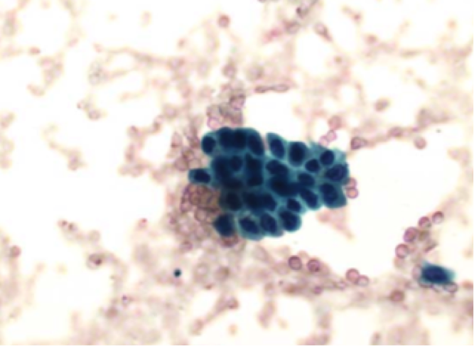 Característicamente, las células del CCT pueden aparecer solas o en pequeños racimos, y presentan grandes núcleos hipercromáticos con cromatina irregular de textura gruesa. Las células malignas identificadas mediante citología pueden clasificarse como: