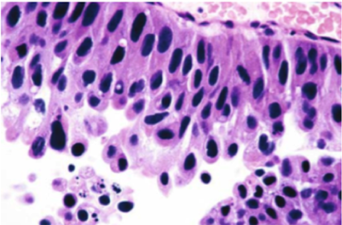 | Carcinoma de Alto Grado. Muestra obtenida de biopsia de vejiga. Se evidencia un aumento en el ratio núcleo citoplasma e hipercromasia nuclear. |