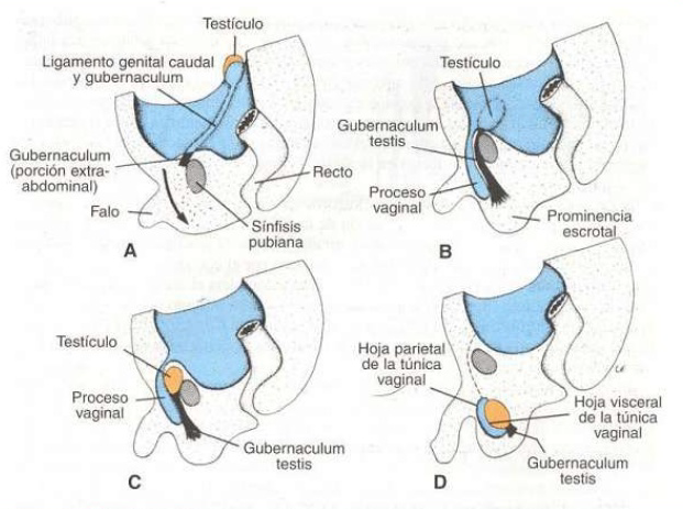 El gobernaculum (timón en latín) será el “ligamento escrotal”. El proceso vaginal, que constituye el divertículo peritoneal – rodea el testículo casi por completo, salvo donde está el ligamento escrotal. Su cavidad, virtual, extensión de peritoneo, se independiza al obliterarse en épocas perinatales el primitivo “conducto peritoneovaginal”. El pedículo vascular principal (arteria, vena y linfáticos), y también los filetes nerviosos, siguen conectados al sitio lumbar originario. Se alargan, unidos a la gónada, hasta su destino definitivo: el pedículo espermático. El ex conducto de Wolff, que será el deferente, queda muy incurvado; sube desde el testículo por detrás de su pedículo vasculonervioso. Con él forman el “cordón espermático” y recorre el trayecto inguinal. Franqueado su orificio superoexterno profundo, se aparta y va a cruzarse con el uréter detrás de la ampolla alantoidea. Se une al tubo excretor de la vesícula seminal constituyendo el eyaculador. Así alcanza su orificio en el margen del verum. Los estímulos y los factores mecánicos que concretan el descenso testicular aún presenta numerosos puntos no aclarados.