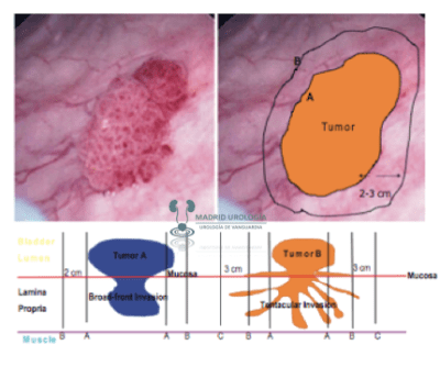 | Esquema gráfico que representa la extensión lateral y en profundidad del cáncer de vejiga. |