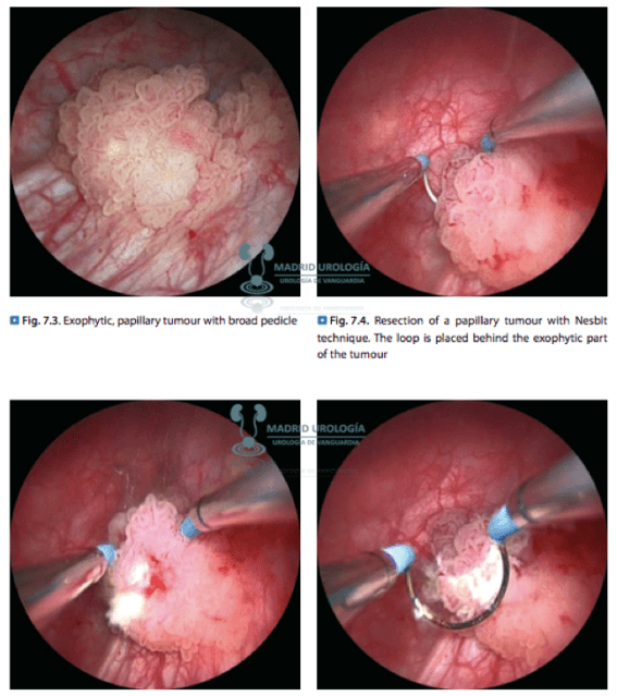 Las lesiones pequeñas pueden ser resecadas de un solo paso o incluso podrían ser fulguradas directamente si el aspecto para el urólogo es de un tumor superficial.En este punto es importante mencionar, que la experiencia del Urólogo en la visualización del tumor, es preponderante en caso no se envíe muestras o esta salga negativa en el estudio anatomo patológico. **