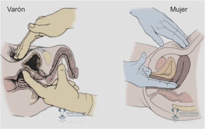 | El tacto bimanual en el varón se realiza a través del recto y en la mujer a través de la vagina. |