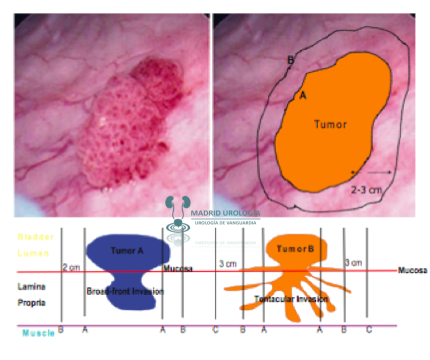| Esquema gráfico que representa la extensión lateral y en profundidad del cáncer de vejiga. |