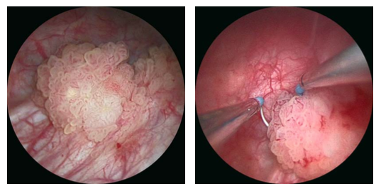 – RTU V en un solo paso para lesiones papilares menores de 1 cm incluyendo parte de la base de la pared vesical **