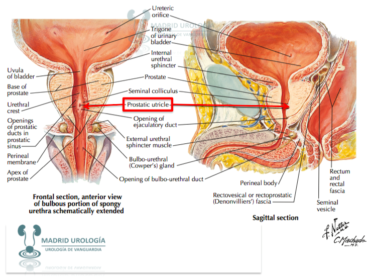 | Esquema demostrativo según Netter para mostrar el Utrículo Prostático fundamentantal como referecnia anatómica para la biopsia de uretra prostática cuando esta este indicada. |
