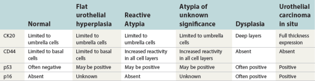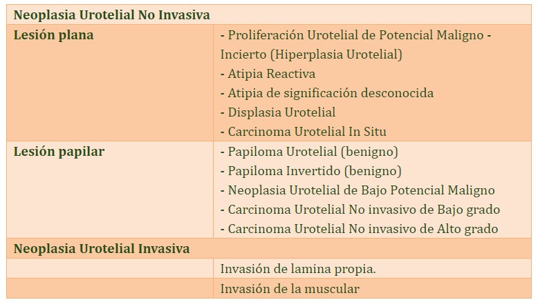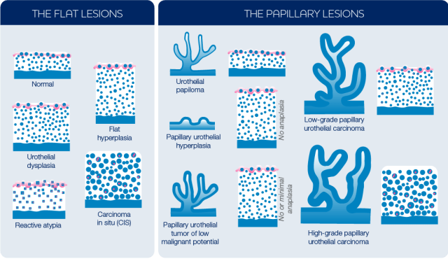 La tabla y el gráfico siguientes uestra las diferencias histológicas de las lesiones planas. Cabe resaltar que la Proliferación Urotelial de Potencial Maligno Incierto (Hiperplasia Urotelial) conserva gran parte de las características de una célula sana respecto al resto de lesiones, siendo distinguible en todo caso la mayor capa de células en su arquitectura.