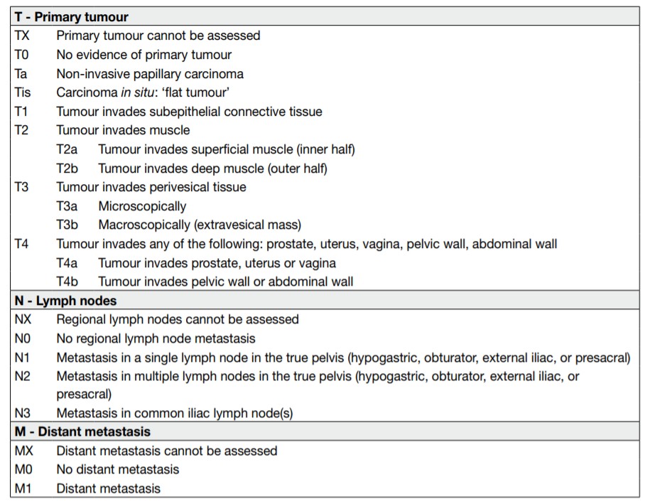 El sistema de puntuación se basa en 7 categorías clínicas y patológicas: sexo, edad, estatus recurrente previo, número de tumores, categoría T, CIS concurrente y grado tumoral.
