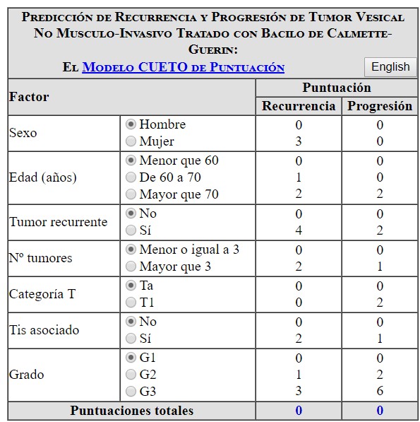 Se basa en el sistema de puntuación desarrollado por el Club Urológico Español de tratamiento Oncológico (CUETO) para valorar el pronóstico de tumores Ta y T1