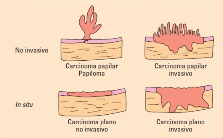 Macroscópicamente, el tumor No Invasivo, se puede subdividir en Lesiones Planas o en Lesiones Papilares.