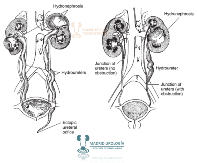El uréter de la mitad superior del riñón drena directamente en la vagina en la zona caudal al esfínter y origina incontinencia urinaria. En algunas ocasiones un Uréter Ectópico se asocia a parénquima displásico y puede ser además obstructivo