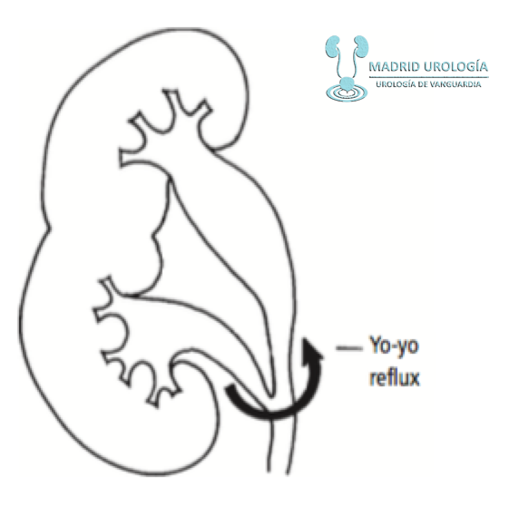 El uréter de la mitad inferior del riñón tiene un recorrido corto a través de la pared de la vejiga, por tanto, menos eficiente como válvula, y la orina puede fluir desde la vejiga hasta el riñón.