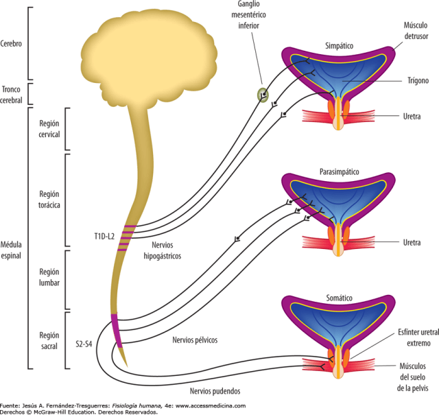 1.Deseo miccional. Se origina en las terminaciones propioceptivas del detrusor, cuando la presión intravesical ha sobrepasado el umbral de reposo, o ha sido incrementada por la iniciación voluntaria de la micción. Los impulsos llegan a la médula y centros superiores a través de los nervios pélvicos e hipogástricos, ya que en denervaciones bilaterales de una sola de estas vías no se suprime el deseo miccional. La sensación cesa durante la contracción vesical.