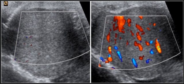 | Izquierda; teste izquierdo con prácticamente ausencia de flujo sanguíneo. Derecha: teste derecho con flujo dopler normal. |