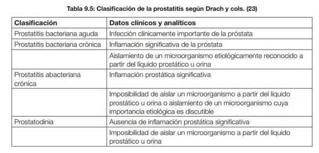 Diez años después, Drach y cols. propusieron una clasificación de la prostatitis basada en el trabajo de Meares y Stamey, en la que se diferenciaban diversos tipos de prostatitis en función del número de leucocitos y cultivos positivos en SPE y en muestras de orina segmentadas, es decir, primera orina vesical evacuada‑1 (VB1), orina de la mitad de la micción (segunda orina vesical evacuada‑2, VB2) y orina obtenida después de un masaje prostático (tercera orina vesical evacuada‑3, VB3). Ha sido la clasificación de la prostatitis más utilizada durante casi treinta años y todavía se incluye en la última clasificación de enferme‑ dades de la OMS (CIE 10)
