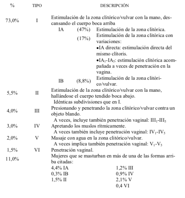 El informe Hite hizo un estudio exhaustivo de la conducta sexual de la mujer mediante entrevista y el uso de cuestionarios aplicado a un número significativo de mujeres. En este estudio se evidencio la presencia de 6 tipos básicos de masturbación que exponemos en la siguiente tabla.