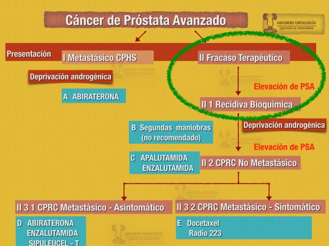Los pacientes con RBQ reciben tratamiento específico y en muchas ocasiones son tributarios a Hormonoterapia con Bloqueo Androgénico. En un sub grupo de estos pacientes la elevación de PSA persiste o reaparece en el tiempo definiéndose clínicamente como Cáncer de Próstata Resistente a la Castración que inicialmente será No Metastásico para posteriormente desarrollar Metástasis. Este último grupo debe ser sub dividido en pacientes Asintomáticos y Sintomáticos.