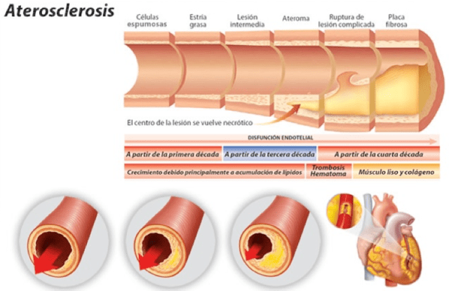 La enfermedad coronaria se basa en el estrechamiento de las arterias coronarias (irrigan el corazón) por una acumulación de lípidos (grasa) en su interior, formando una estructura que se conoce como placa arteriosclerótica. Cuando esta placa se rompe se produce un trombo en su interior, el que obstruirá el flujo sanguíneo provocando lo que se conoce como un infarto. Si este trombo es a nivel de una arteria coronaria se denomina IAM, y si la arteria involucrada es a nivel cerebral se producen los llamados accidentes vasculares encefálicos (AVE).