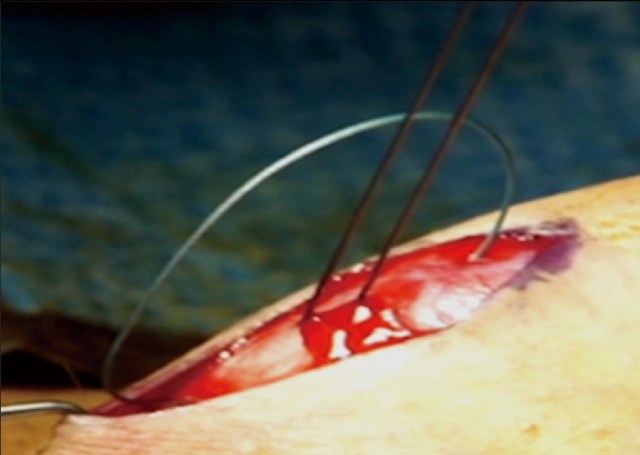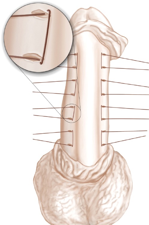 Se realiza una incisión transversal de 5 mm a lo largo de las marcas con un cuchillo fino, sin cortar el cuerpo cavernoso. Esto se hace para preparar una cavidad para los nudos invertidos. Se coloca una sutura de Gore-Tex 4-0 de doble brazo a través de los bordes exteriores de las dos incisiones adyacentes. La aguja de doble brazo se guía de afuera hacia adentro en cada lado para que el nudo se pueda atar dentro de la incisión.