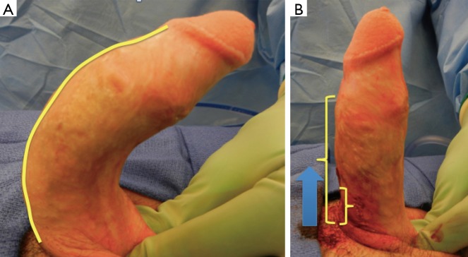 Se realiza una inyección intracavernosa con 20 mcg de alprostadil (PGE1). Luego se afeita la base del pene y se prepara y cubre al paciente de la forma estéril habitual. El pene ahora está agarrado agresivamente en la base para evaluar la extensión, dirección y ubicación de la deformidad del pene. Esto determinará la ubicación de la incisión en la piel y ayudará a planificar la ubicación de la sutura de plicatura. Si se indujo una erección deficiente, se pueden administrar 20 mcg adicionales de alprostadil o se puede inducir una erección artificial usando solución salina inyectable con una aguja de mariposa.