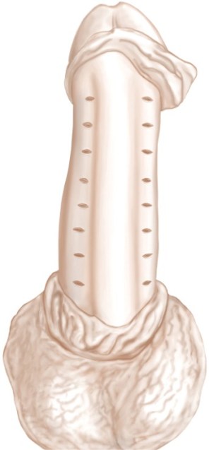 La fascia de Buck se disecciona bilateralmente, paralela a la uretra. La incisión de la fascia se realiza con una disección posterior hasta la túnica albugínea, que luego queda completamente expuesta. Usando una pluma quirúrgica marcamos 8 puntos bilateralmente (16 en total) en la albugínea, comenzando desde el surco coronario hasta la base del pene. Ponemos los puntos en el mismo lugar y la misma distancia entre los puntos. Esto ayuda a estandarizar el procedimiento de «nudos de kiel» y lo hace más fácil. En caso de «corrección excesiva», soltamos uno o dos nudos, hasta que la rectitud del pene sea aceptable. Además, intentamos obtener al menos un juego de suturas por encima y por debajo del nivel de una curva máxima. La distancia entre los puntos marcados es de aproximadamente 5 mm.