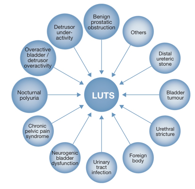 La respuesta común que le dan al joven es por que sufre de prostatitis, sin embargo la respuesta no debería ser tan sencilla. En primer lugar los síntomas experimentados por una persona no son específicos de la próstata y se denominan síntomas urinarios del tracto urinario bajo. Las causas de estos síntomas son muchas y el dibujo muestra sólo algunas de las decenas de causas, de ahí la importancia de la adecuada evaluación del paciente para evitar diagnósticos inadecuados y tratamientos ineficientes.