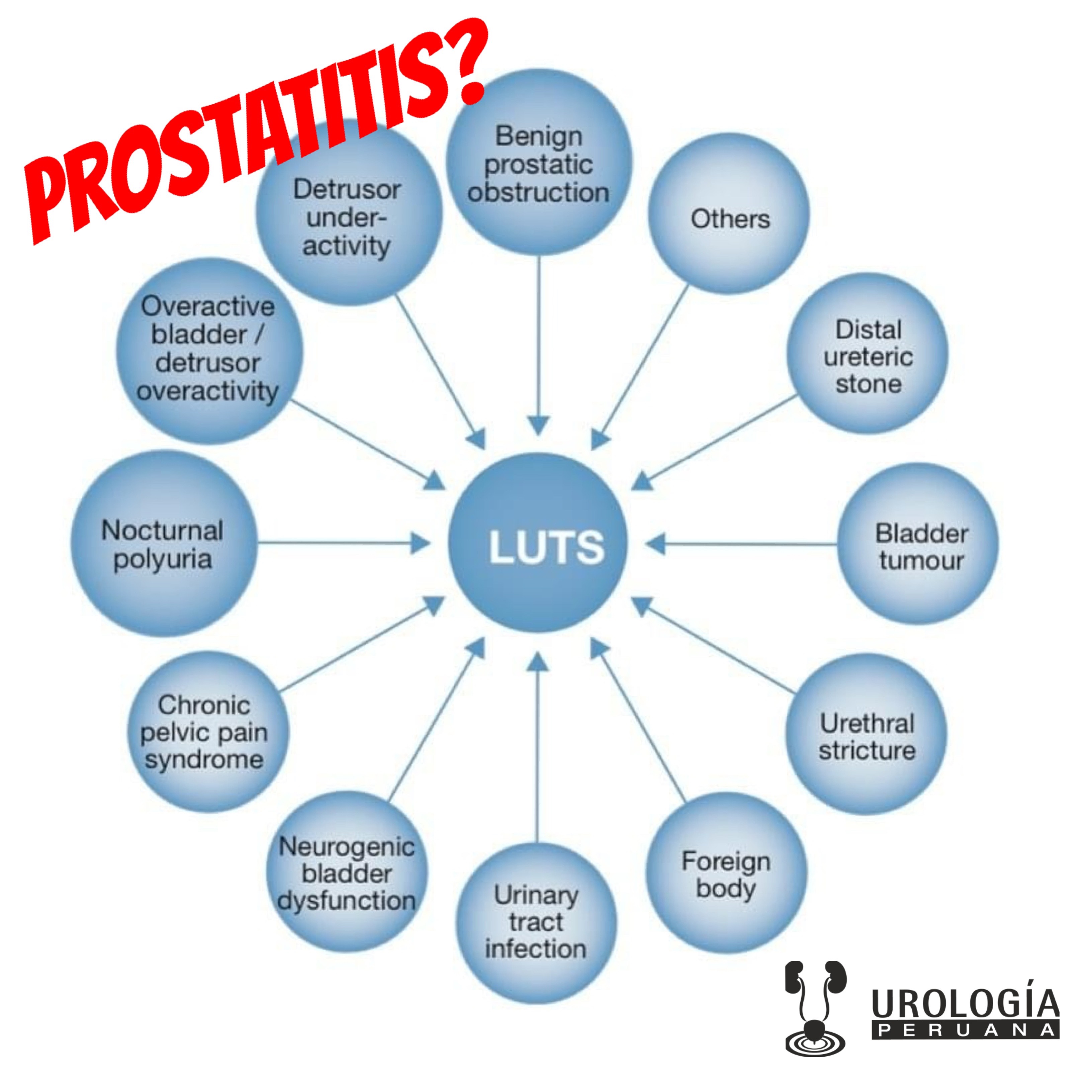 El dibujo que acompaña del presente artículo nos ilustra a estos mismos síntomas que son conocidos en la literatura científica anglosajona como LUTS: Lower urinary tract symptom (síntomas del tracto inferior bajo) y como bien señala el gráfico, las causas son muchas de estos síntomas; de ahí que afirmar que solamente se deben a una enfermedad de la próstata, es en ocasiones errado.