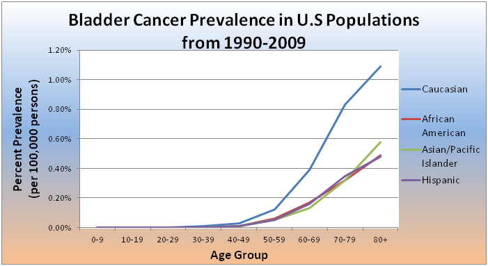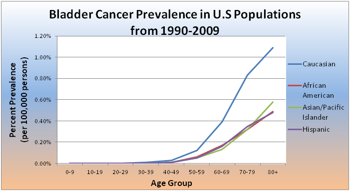 Las personas de raza blanca son doblemente más propensas a padecer cáncer de vejiga que las personas de raza negra y los hispanos. Los estadounidenses de raza oriental y los indios estadounidenses tienen tasas ligeramente más bajas de cáncer de vejiga. Las razones de estas diferencias no son bien conocidas.