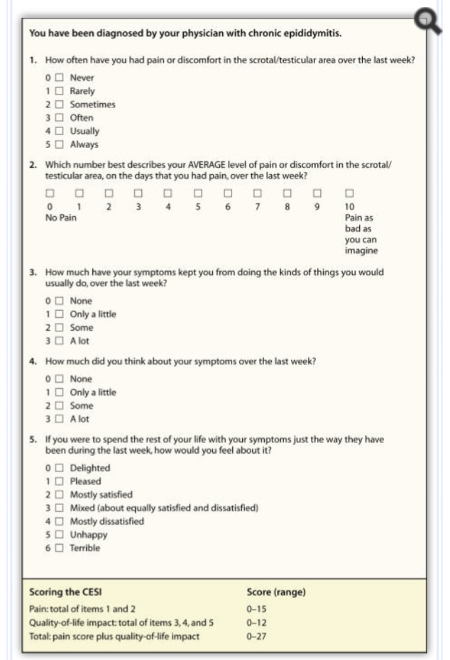 Hay una serie de condiciones urológicas para las cuales la evaluación de los síntomas es la única forma razonable de estratificar a los pacientes en cuanto a la gravedad y seguirlos a lo largo del tiempo. Los índices de síntomas validados han demostrado ser invaluables para estas condiciones, no solo en los ensayos de tratamiento clínico sino también en la práctica clínica. Estas condiciones incluyen hiperplasia prostática benigna, prostatitis crónica, disfunción eréctil y cistitis intersticial. Con este motivo se desarrolló y validó un índice de síntomas que puede tener un propósito similar para la evaluación inicial y el seguimiento de pacientes con epididimitis crónica, tanto en la práctica clínica como en ensayos de tratamiento de investigación. Los investigadores le denominaron CESI de las siglas anglosajonas Chronic Epididimitis Symptoms Index.