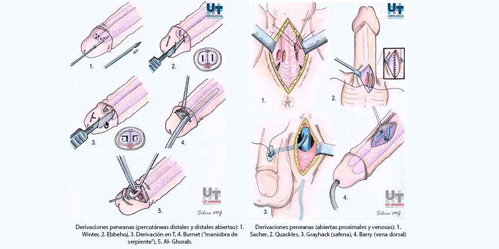 - Los médicos deben realizar una derivación mediante una fístula cavernoesponjosa corporo-glandular distal, con o sin tunelización, en pacientes con priapismo isquémico agudo en quienes falló la reversión farmacológica intracavernosa y la aspiración cavernosa, con o sin irrigación. Recomendación Moderada, Nivel de Evidencia: Grado C.