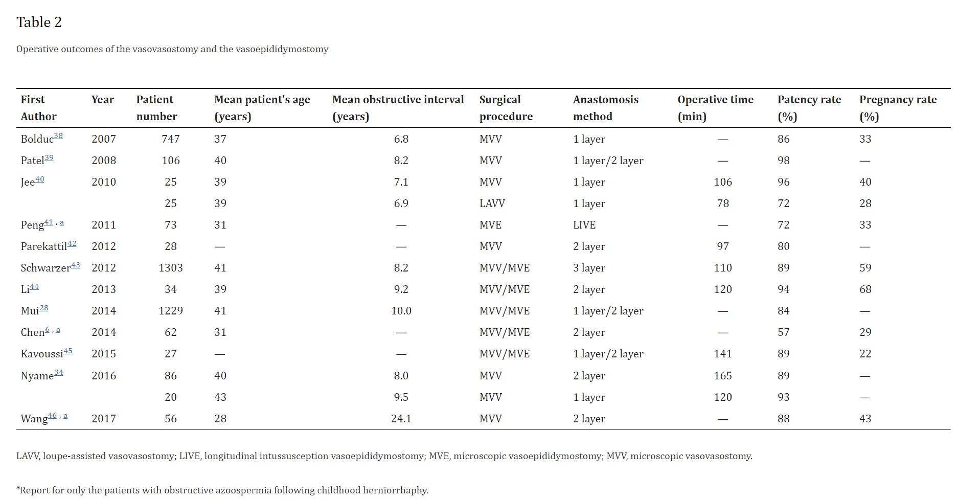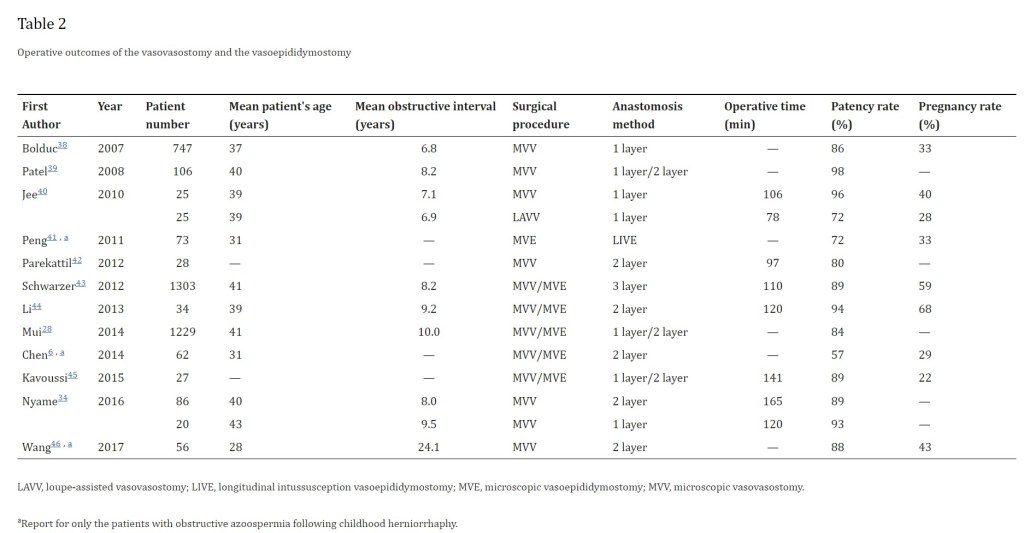 El Dr. Takeshi Namekawa hizo una revisión de 10 años de procedimientos de VV y VE. Describió una edad media de 40 años, el intervalo obstructivo medio fue de 8,5 años, el tiempo operatorio medio fue de 114 minutos, la tasa de permeabilidad media fue del 87 % (rango: 80 %‐98 %) y la tasa de embarazo media fue de 49 % (rango: 22%‐68%) en los pacientes que se sometieron a una MVV y/o vasoepididimostomía microscópica (MVE) para una VR. Los altos índices de permeabilidad después de una VV y VE denenden de si son hechas por cirujanos experimentados que utilizan técnicas microquirúrgicas. Nosotros contamos con la experiencia de los Drs. Susaníbar y el Profesor Iwaki para estos procedimientos.