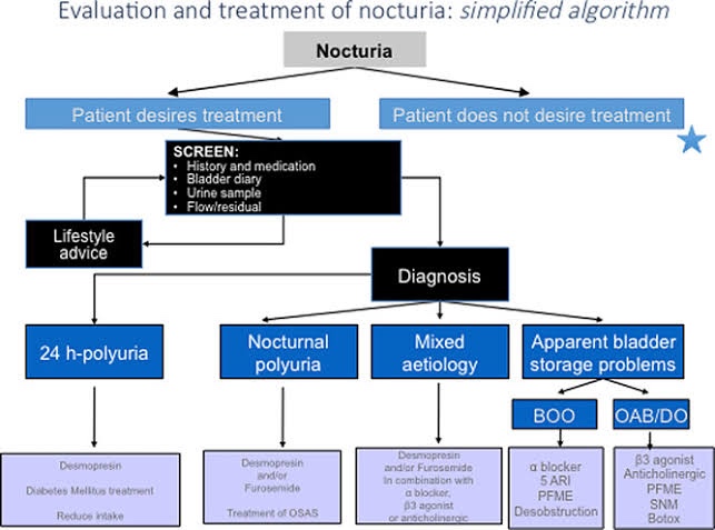 Históricamente se han utilizado los medicamentos alfa bloqueadores con el objetivo de disminuir los síntomas del tracto urinario inferior que no se dio en la causa neurológica, siendo el resultado de estos tratamientos efectivos pero en ocasiones sin lograr vencer la nocturia. Una parte fundamental del tratamiento es la modificación de estilos de vida del paciente y en ello estriba la uroterapia, mediante la cual se trata de condicionar el funcionamiento de la vejiga tanto de día como de noche aplicando una serie de estrategias que hemos comentado oportunamente en este blog.