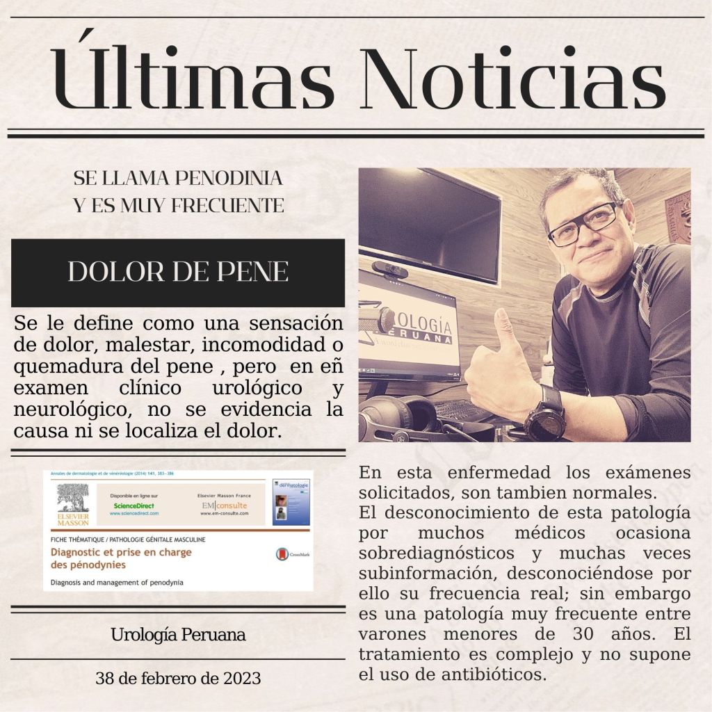 Provenientes de las raices latinas penis (pene) y dinia (dolor), la penodinia se define como una sensación de dolor, malestar, incomodidad o quemadura de la piel genital, sin embargo en el examen clínico urológico y neurológico, no se evidencia la causa ni se localiza el dolor. Los exámenes solicitados, son tambien normales. El desconocimiento de esta patología por muchos médicos ocasiona sobrediagnósticos y muchas veces subinformación, desconociéndose por ello su frecuencia real; sin embargo es una patología muy frecuente entre varones menores de 30 años.