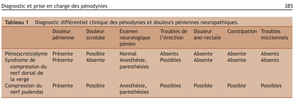 - Dolor neuropático: debe ser evocado cuando el paciente describe una sensación de entumecimiento, anestesia u hormigueo (parestesia) del pene, signos sugestivos de daño neurológico por lesión del sistema nervioso periférico, ya sea un daño distal al nervio dorsal del pene (neuropatía pene) o una afectación más proximal (neuralgia pudendo por ataque del nervio pudendo, anteriormente conocido como el nervio pudendo interno) (Tabla anexa). Se trata de una diagnóstico difícil de establecer, corriendo el riesgo de concluir erróneamente en un origen psicógeno. El origen de la neuralgia del pudendo puede ser radicular (síndrome cauda equina, canal lumbar estrecho, fractura o tumor del sacro), del plexo (por daño al plexo pudendo después de la amputación del recto, estirando sobre mesa de cirugía ortopédica) o troncal (compresión del nervio pudendo, neuropatía metabólica, tóxico o infeccioso)