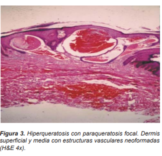 hiperqueratosis paraqueratósica, acantosis y papilomatosis; a nivel dérmico superficial y medio, se encuentran