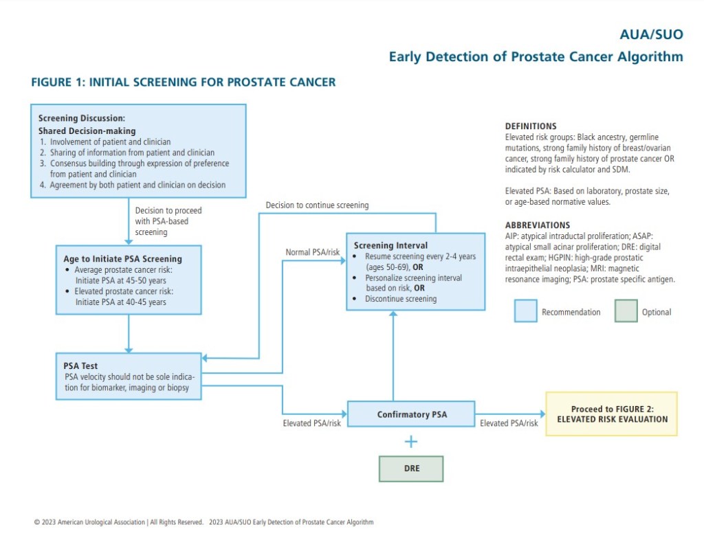 - Los médicos pueden personalizar el intervalo de reevaluación o decidir suspender la detección, según la preferencia del paciente, la edad, el PSA, el riesgo de cáncer de próstata, la esperanza de vida y el estado general de salud después de la MDF. ( Recomendación condicional; Nivel de evidencia: Grado B )