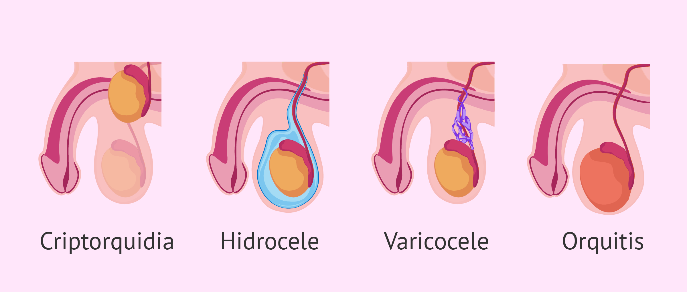 - Varicocele: dilatación anormal de las venas en el escroto, que puede provocar dolor y sensación de pesadez. El urólogo podrá sentir una agrupación de venas dilatadas y tortuosas en el cordón espermático. Usualmente, se describe como una sensación de «gusanos» o «sacos de gusanos» al palpar.