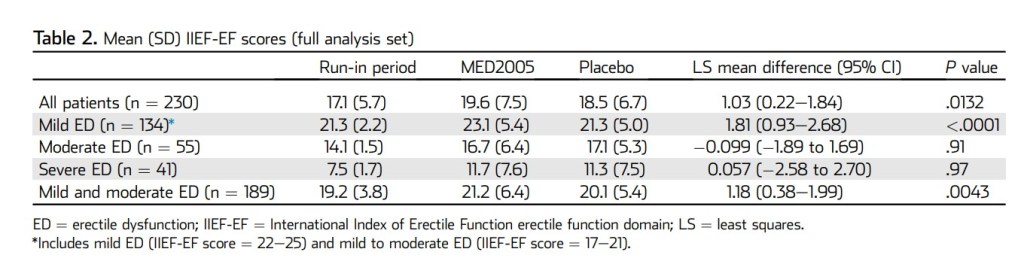 En ambos casos, se observó una mejora en la función eréctil. En el grupo que recibió el tratamiento con MED2005, la mejora fue de 17 a 19, mientras que en el grupo que recibió el placebo, la mejora fue de 17 a 18.5. El valor de p para la significancia estadística fue de 0,0132, lo que indica una diferencia estadísticamente significativa, aunque bastante débil.