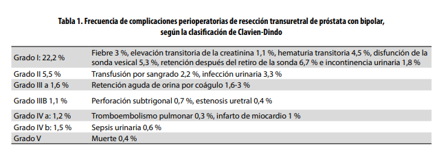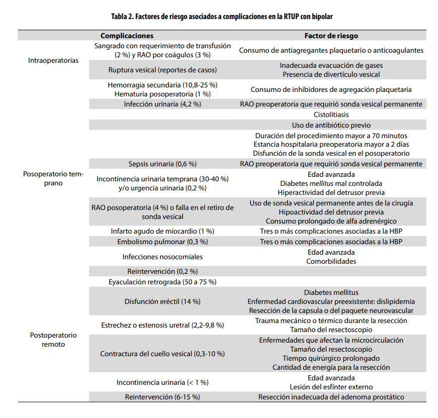 - Factores de riesgo asociados a complicaciones perioperatorias en la resección transuretral de próstata con bipolar. Revisión narrativa de la literatura. http://www.scielo.org.co/pdf/iat/v32n2/0121-0793-iat-32-02-00102.pdf