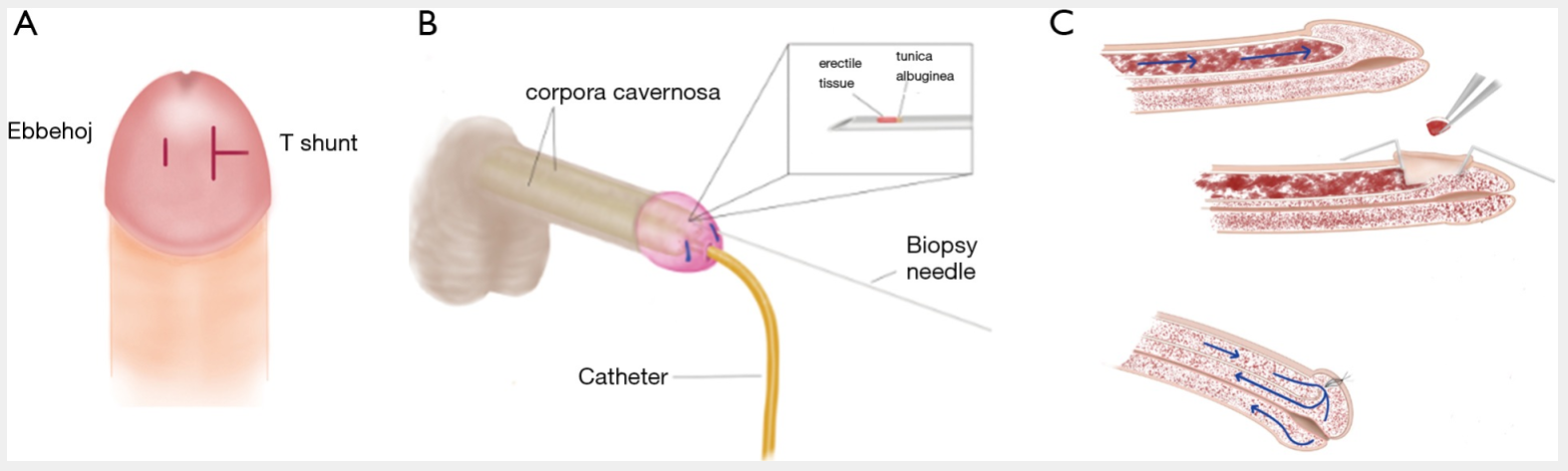 Procedimientos de derivación quirúrgica distal para el priapismo isquémico. (A) Derivación de Ebbehoj comparada con derivación en T. Se crea una derivación de Ebbehoj utilizando un bisturí de hoja n.º 11 para atravesar el glande hasta la punta distal del cuerpo corporal. Se crea una derivación en T insertando un bisturí de hoja n.° 10 a través del glande hasta la punta de los cuerpos y girando el bisturí 90 grados, lo que lleva a una incisión en “forma de T” en el glande al finalizar el procedimiento; (B) Derivación de invierno. Se utiliza una aguja de biopsia para extraer un núcleo de la túnica albugínea en las puntas distales de los cuerpos cavernosos; (C) Derivación de Al-Ghorab. Las puntas distales de los cuerpos cavernosos se extirpan a través de una incisión en el glande.