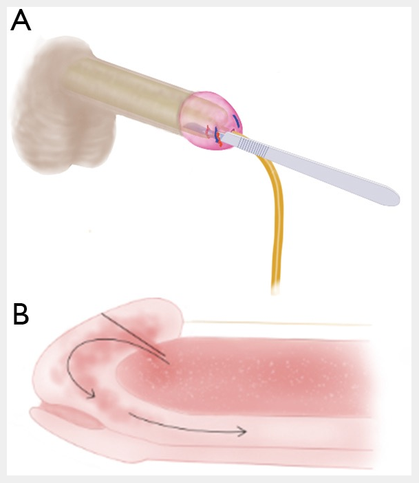 Técnica quirúrgica para el procedimiento de derivación en T. (A) Se inserta un cuchillo de hoja n.º 10 a través del glande hasta el centro de la hoja. El mango del cuchillo se gira 90 grados lateralmente y luego se retira para agrandar el defecto de la túnica; (B) se crea una abertura o derivación desde el cuerpo cavernoso a través del glande hasta el cuerpo esponjoso para permitir la evacuación de la sangre de los cuerpos isquémicos y adaptarse al estado de alto flujo de la hiperemia postisquémica.