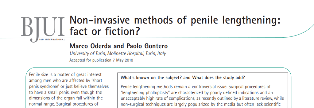 - Oderda M, Gontero P. Non-invasive methods of penile lengthening: fact or fiction? BJU Int. 2011 Apr;107(8):1278-82. doi: 10.1111/j.1464-410X.2010.09647.x. Epub 2010 Sep 24. PMID: 20868389.