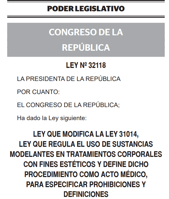 Artículo único. Modificación de los artículos 2, 3, 4 y 8 de la Ley 31014, Ley que regula el uso de sustancias modelantes en tratamientos corporales con fines estéticos y define dicho procedimiento como acto médico. Se modifican los artículos 2, 3, 4 y 8 de la Ley 31014, Ley que regula el uso de sustancias modelantes en tratamientos corporales con fines estéticos y define dicho procedimiento como acto médico, que quedan redactados con los textos siguientes:
