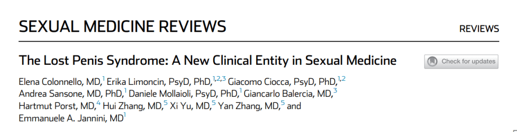 Elena Colonnello, Erika Limoncin, Giacomo Ciocca, Andrea Sansone, Daniele Mollaioli, Giancarlo Balercia, Hartmut Porst, Hui Zhang, Xi Yu, Yan Zhang, Emmanuele A. Jannini, The Lost Penis Syndrome: A New Clinical Entity in Sexual Medicine, Sexual Medicine Reviews, Volume 10, Issue 1, January 2022, Pages 113–129, https://doi.org/10.1016/j.sxmr.2021.08.001