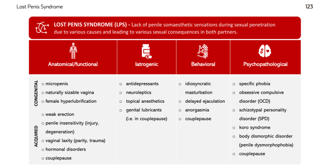 Definición y clasificación del síndrome del pene perdido (SPP), según las causas más frecuentes y los factores de riesgo asociados. Tenga en cuenta que los múltiples cambios que ocurren con el envejecimiento, que potencialmente afectan la salud sexual del paciente y de su pareja, así como su relación mutua, se han definido, con una sola palabra, en un enfoque orientado a la pareja, como pausa de pareja. Debido a su complejidad, esta entidad puede considerarse como un factor de riesgo para experimentar varios subtipos de SPP, debido a sus cambios anatómicos/funcionales, uso generalizado. de lubricantes genitales, y aspectos conductuales y psicopatológicos específicos.
