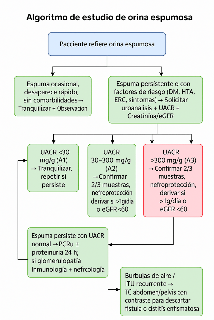 - En una revisión de pacientes ambulatorios nuevos, el 6.3 % se quejó de orina espumosa; de estos, solo el 22 % presentaba proteinuria franca, y en un subgrupo, hasta el 31.6 % tenía microalbuminuria u overt proteinuria.