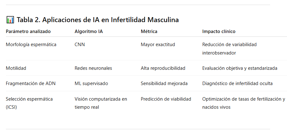 🔹 Tabla 2: Aplicaciones de IA en infertilidad masculina.