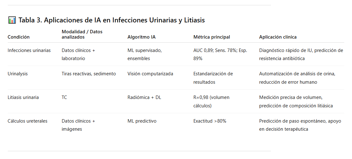 🔹 Tabla 3: Aplicaciones de IA en infecciones urinarias.