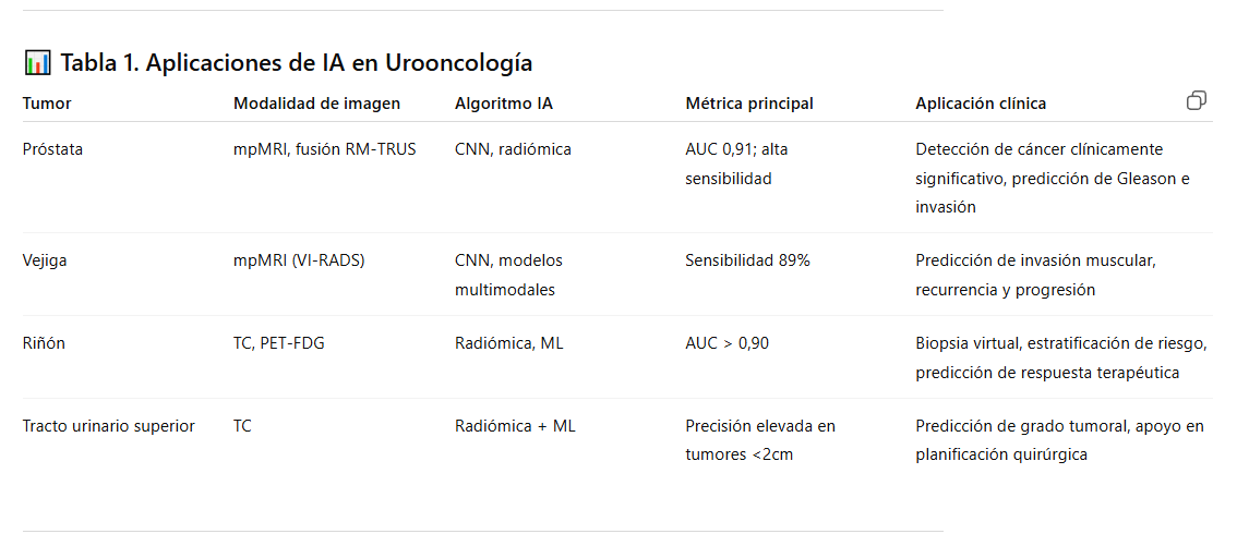 🔹 Tabla 1: Aplicaciones de IA en urooncología.